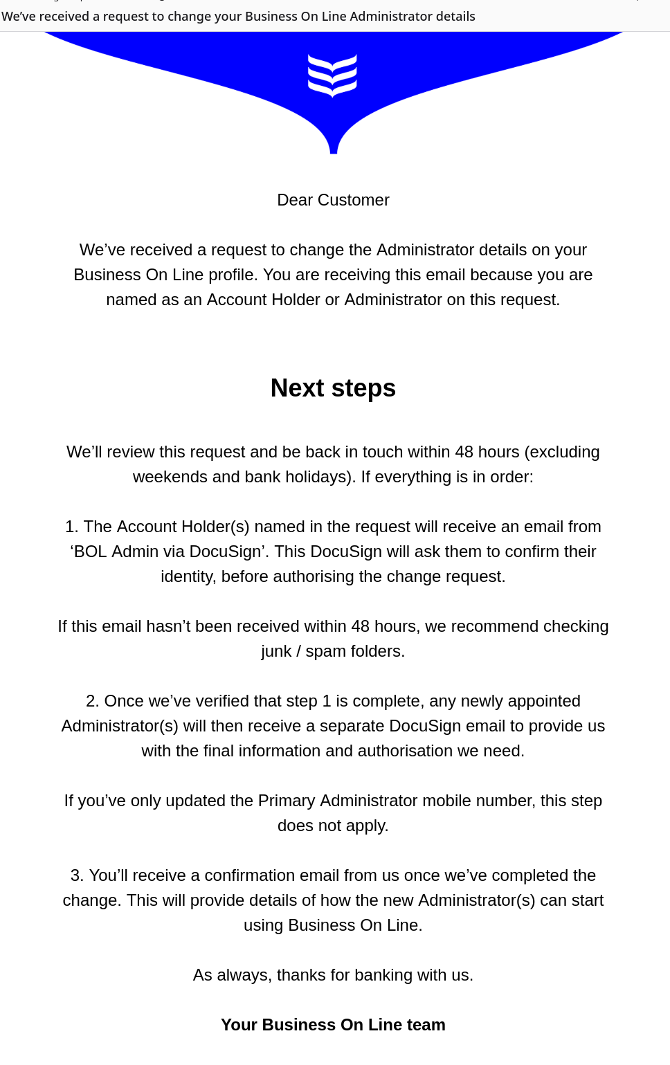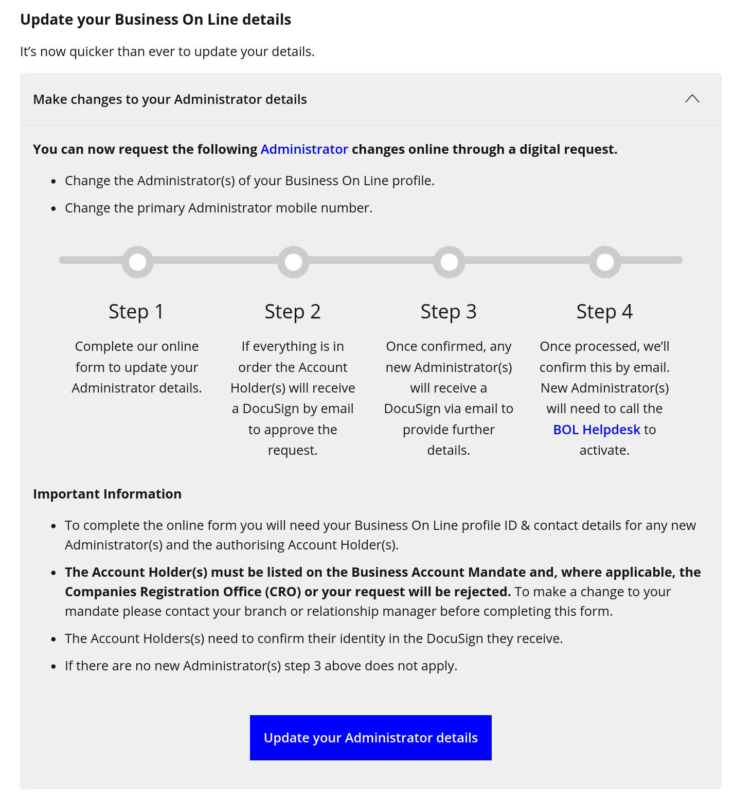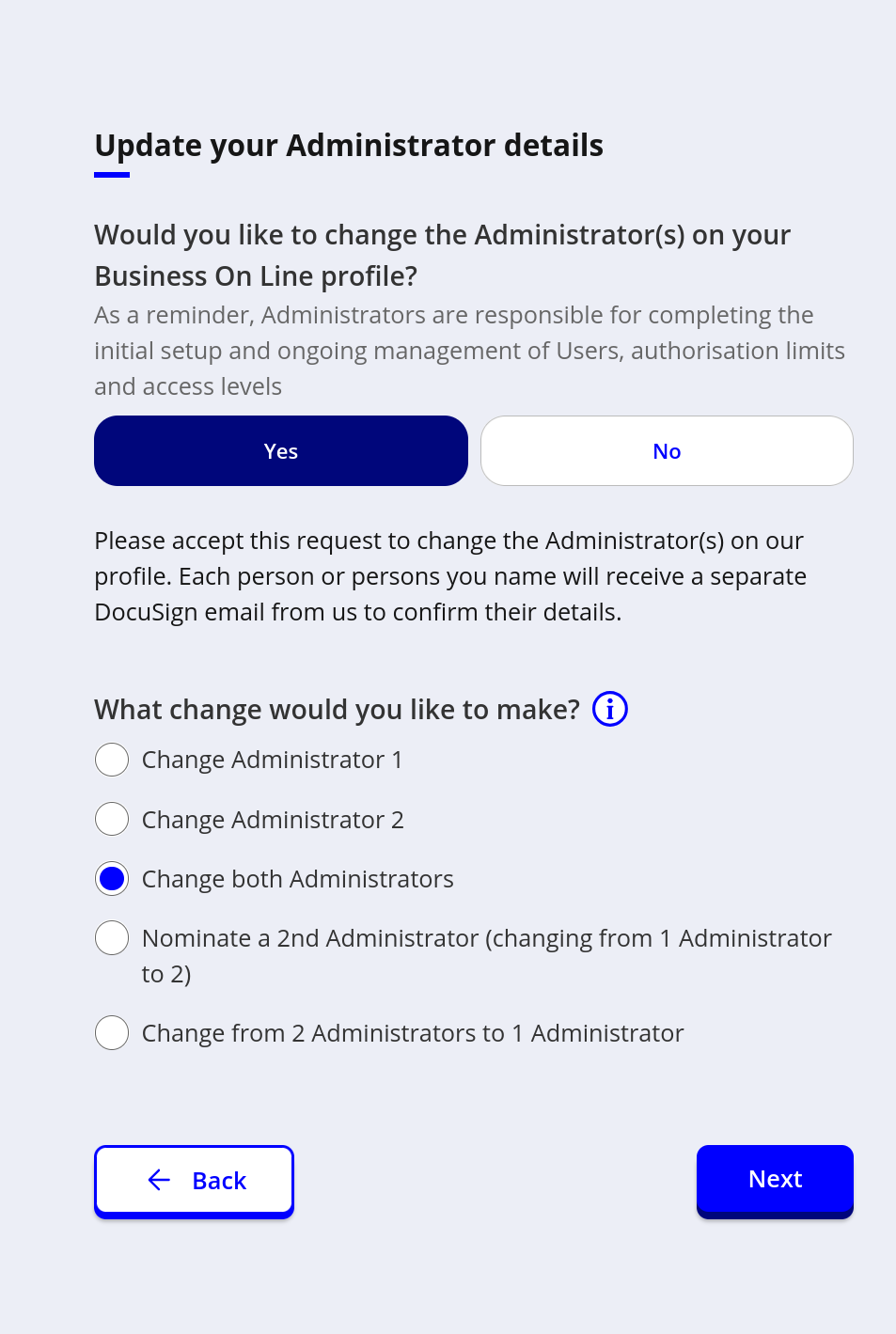 Would you like to change the Administrator(s) on your Business On Line profile?