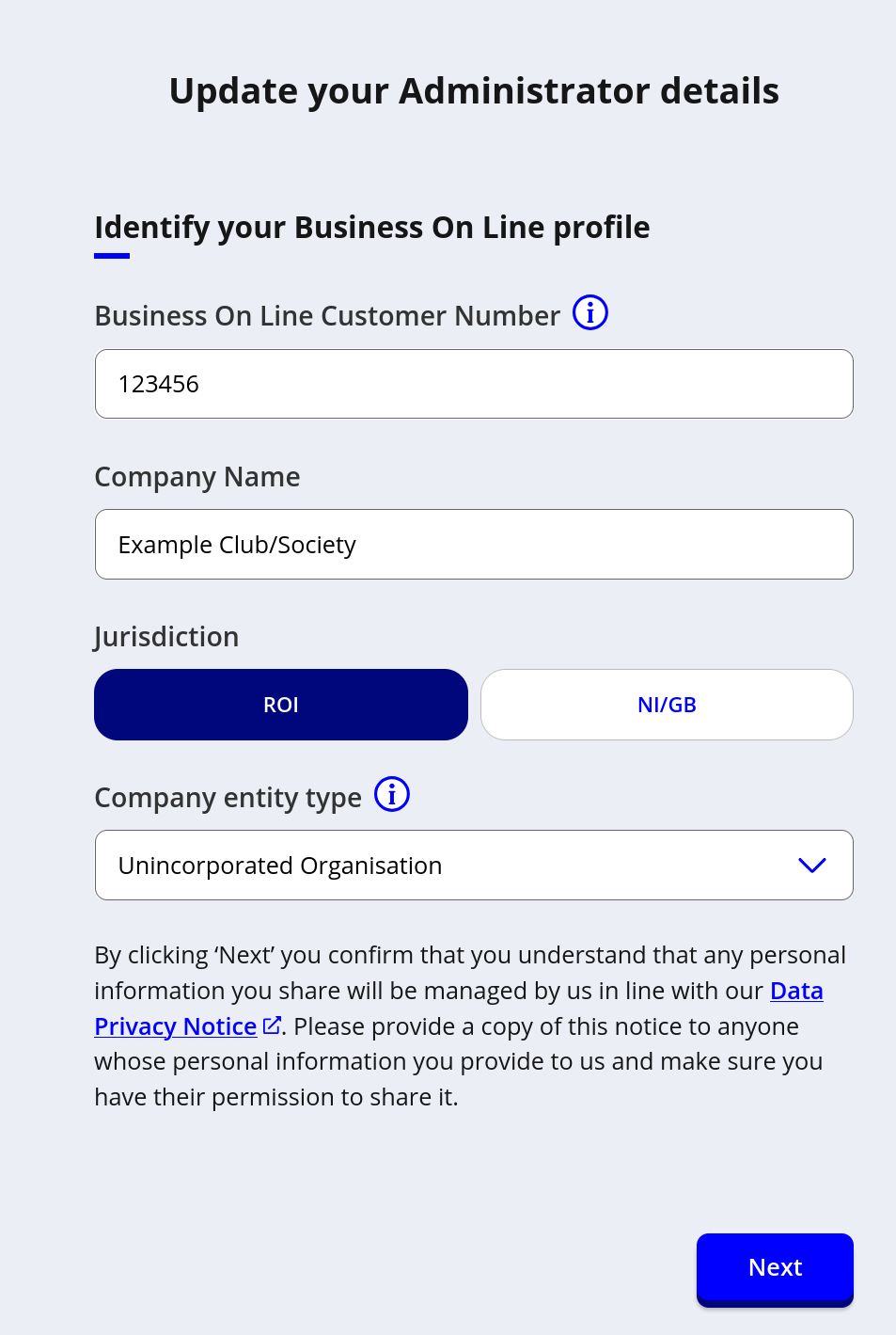 Business On Line Customer Numbersee above.Company Namesee above.JurisdictionisROICompany entity typeisUnincorporated OrganisationNext